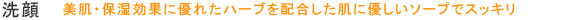 あわ立てネットなどでよく泡立て、肌表面で泡を転がすように優しくあらったらぬるま湯ですすぎ、その後ローションで整えます。全身にご使用できます。 水、ステアリン酸、グリセリン、ヒアルロン酸Na、PCA−Na、コムギアミノ酸、パンテノール、コンフリーエキス、ヒドロキシプロリン、 セタノール、センチフォリアバラ花水、ステアリン酸グリセリル、ミリスチン酸イソプロピル、ジメチコン、トリ(カプリル/カプリン酸)グリセリル、TEA、 アロエベラ液汁、カプリルヒドロキサム酸、フェノキシエタノール、メチルプロパンジオール、香料、アンズ核油、シア脂、 トコフェロール、ジアゾリジニル尿素、 ブチルカルバミン酸ヨウ化プロピニル、亜硫酸Na、EDTA−4Na、テトラ(ジ−t−ブチルヒドロキシヒドロケイヒ酸)ペンタエリスリチル 精製水・ヒマシ油・カオリン・セテアリルアルコール・酸化亜鉛・クルミ殻エキス・ビャクダンエキス・ステアリン酸グリセリル・グリセリン・ ラウリル硫酸Na・パラベン・酸化鉄