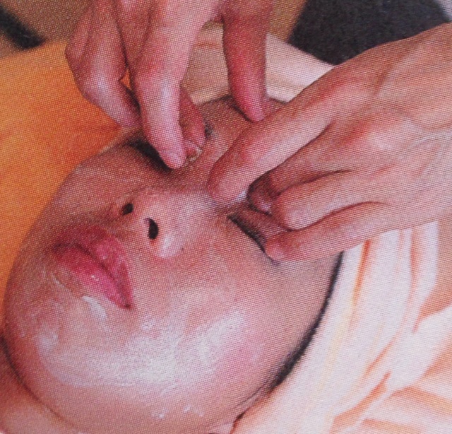 セルフクレンジングの後、オゾンスチーマーでお肌を殺菌しながらビタミンたっぷりの美容ハーブオイルでツボを刺激し表情筋の疲れを取り除きながら引き上げマッサージをします。(リフトアップ効果大)